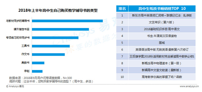 高中生因为面临升学压力,有92.3%的学生在教辅书的选择上倾向于与教材同步,阅读课外指定必读书目上的占比为74.0%。高中生纸书畅销榜TOP10的排名上,与考试相关的英语学习,适用于教材的数学,物理等教学大纲辅导书居多,反映出学生加强对基础知识的学习和巩固。