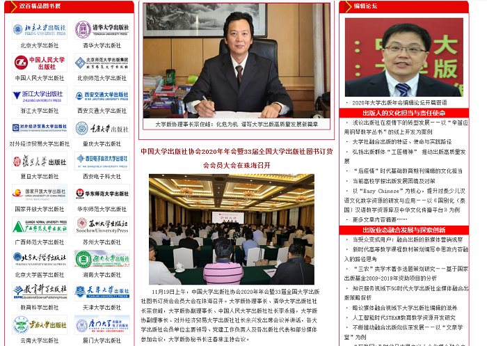 本网讯 中国大学出版社协会2020年年会暨第33届全国大学出版社图书订货会(下称年会)以“加强党建引领,推动大学出版社在新形势下的高质量发展”为主题,于2020年11月在广东省珠海市举行。为适应疫情防控要求,本届年会首次采用线上线下相结合的方式。线下会议,即“第八届大学版协2020年理事会议”、“第八届大学版协2020年会员大会”、“大学出版论坛”采用传统形式在珠海市现场举办。线上活动,包括“双百精品图书展”、“编辑论坛”、“社长寄语”等活动,在中国高校教材图书网上同步举办。