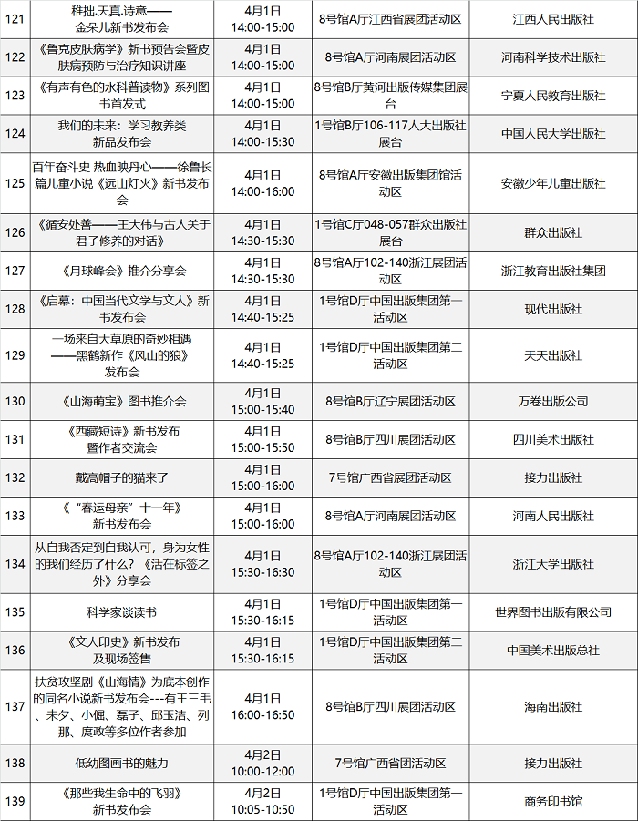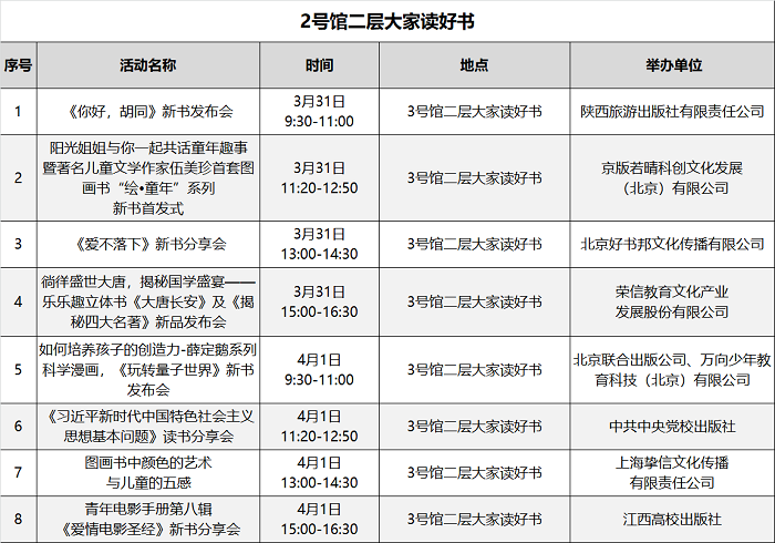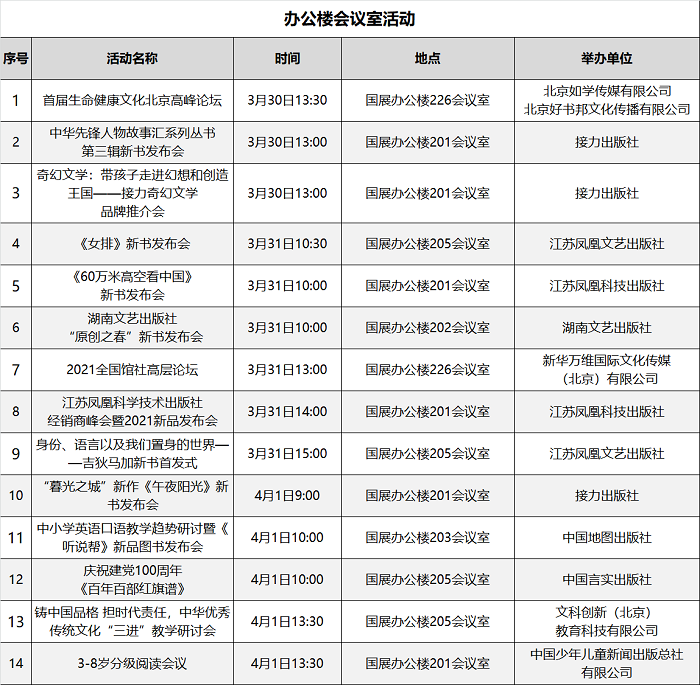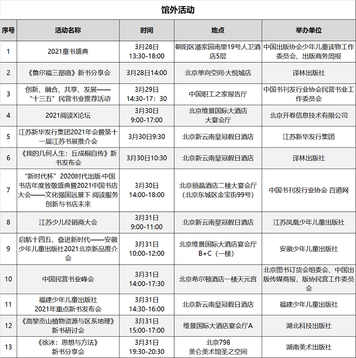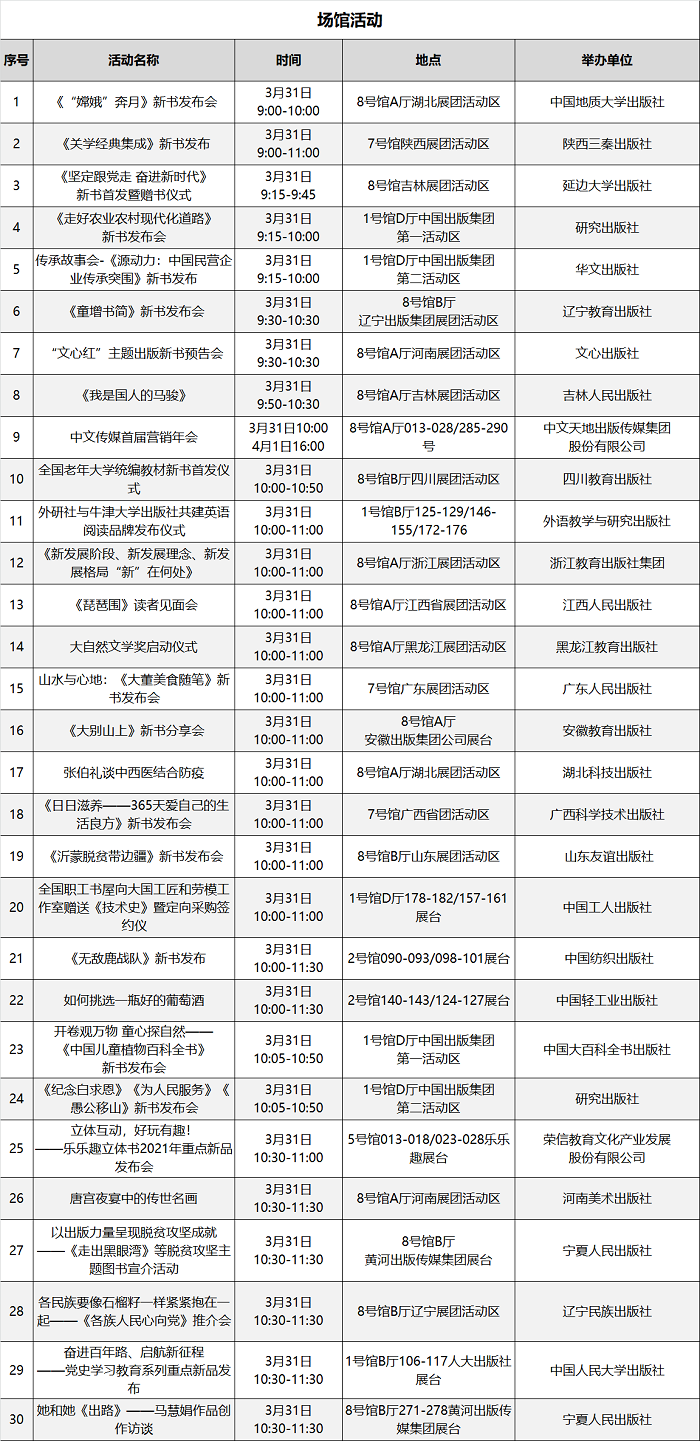 本届图书订货会精心策划场内场外丰富多彩的文化活动200余场,汇总表如下: