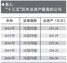 从总资产来看,5年来总资产超100亿元的公司数量分别为6家、9家、9家、10家、10家。从2017年开始出现总资产超200亿元的公司,2017年有2家,2018年、2019年和2020年各有3家。5年来进入总资产“百亿”阵营的10家公司分别是凤凰传媒、中文传媒、中南传媒、山东出版、新华文轩、皖新传媒、中国出版、中原传媒、南方传媒、长江传媒。其中凤凰传媒、中文传媒和中南传媒“三驾马车”在后3年连续坚守总资产“二百亿”阵营。