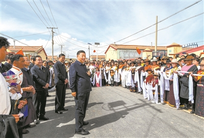 离开索南才让家,村民们看到总书记来了,热情地涌到路边,欢呼着向总书记问好。习近平动情地说,看到乡亲们过上幸福生活,我感到很欣慰。我们要继续奋斗,到新中国成立一百周年时中华民族一定能够更加坚强地屹立于世界民族之林。全面建设社会主义现代化国家,一个民族也不能少。在中华民族大家庭中,大家只有像石榴籽一样紧紧抱在一起,手足相亲、守望相助,才能实现民族复兴的伟大梦想,民族团结进步之花才能长盛不衰。习近平祝福大家“扎西德勒”。