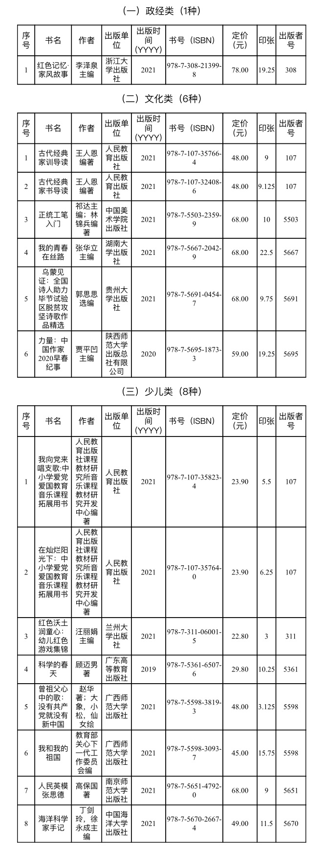 其中,浙江大学出版社《红色记忆•家风故事》入选政经类图书推荐增补书目;人民教育出版社《古代经典家训导读》、《古代经典家书导读》,中国美术学院出版社《正统工笔入门》,湖南大学出版社《我的青春在丝路》,贵州大学出版社《乌蒙见证:全国诗人助力毕节试验区脱贫攻坚诗歌作品精选》,陕西师范大学出版社《力量:中国作家2020早春纪事》入选文化类图书推荐增补书目;人民教育出版社《我向党来唱支歌:中小学爱党爱国教育音乐课程拓展用书》、《在灿烂阳光下:中小学爱党爱国教育音乐课程拓展用书》,兰州大学出版社《红色沃土润童心:幼儿红色游戏集锦》,广东高等教育出版社《科学的春天》,广西师范大学出版社《曾祖父心中的歌:没有共产党就没有新中国》、《我和我的祖国》,南京师范大学出版社《人民英模张思德》,中国海洋大学出版社《海洋科学家手记》入选少儿类图书推荐增补书目。