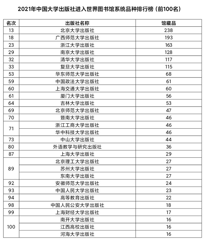 本网讯 近日,中国出版传媒商报联合北京外国语大学国际新闻与传播学院、中国文化走出去效果评估中心课题组发布了《2021年中国图书海外馆藏影响力报告》。《报告》以世界图书馆系统入藏中国大陆出版机构的书目数据为基础,追踪中国出版物在全球的流通轨迹,勾勒出中华文化在当今世界的传播范围。该项年度评估研究基于第三方客观数据,不仅为业界及时提供世界机构市场对于中国大陆出版物的及时反馈,也丰富了传播学界对于传播效果研究的方法手段,其发布的海外馆藏数据已经成为中国出版界衡量世界影响力的一个行业认可的客观指标。报告数据显示,2021年度共有467家出版社的17300种中文图书进入海外图书馆系统永久收藏,其中29家大学出版社的1779种中文图书进入选。