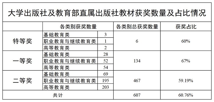 此次评奖中共有52家大学出版社获得全国优秀教材奖项607个,其中基础教育类奖项100项,职业教育与继续教育类奖项248项,高等教育类奖项259项。