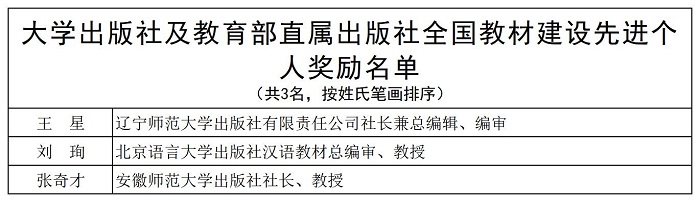 大学出版社坚定政治立场,坚持正确的价值取向,牢固树立“四个意识”,坚定“四个自信”和“两个维护”,多年来培养了大批热爱出版,富有情怀,坚持改革,勇于创新的出版人,在国家教材建设中发挥着引领和骨干作用。本次评选中,共有3人获评全国教材建设先进个人,分别是辽宁师范大学出版社有限责任公司社长兼总编辑、编审王星,北京语言大学出版社汉语教材总编审、教授刘珣,安徽师范大学出版社社长、教授张奇才。