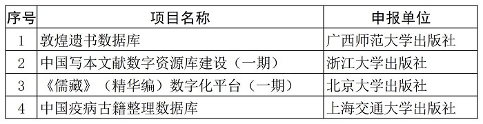 本网讯 11月15日,2021年度国家古籍数字化工程专项经费拟资助项目名单公示。大学出版社共有4个项目入选,分别是广西师范大学出版社《敦煌遗书数据库》、浙江大学出版社《中国写本文献数字资源库建设(一期)》、北京大学出版社《〈儒藏〉(精华编)数字化平台(一期)》、上海交通大学出版社《中国疫病古籍整理数据库》。