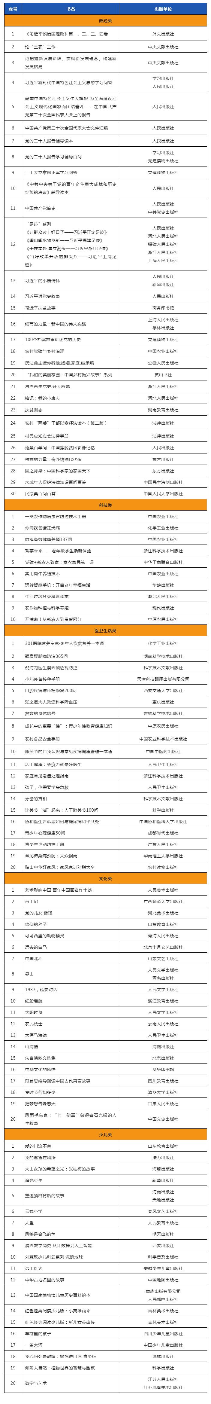 其中包括党的二十大报告单行本等二十大文件及学习辅导读物,以及《习近平谈治国理政》第一、二、三、四卷,《论“三农”工作》等一批党的创新理论著作和主题出版物。既有《沧桑百年间:中国摆脱贫困影响记忆》《党建+新农人致富:富农富民第一课》等反映脱贫攻坚和乡村振兴成果、帮助农民提升致富技能的图书,也有《靠山》《远去的白马》《红色经典阅读少儿版:小英雄雨来》等引导农村青少年坚定理想信念、厚植家国情怀的读物,以及《农村食品安全手册》《智享未来——老年数字生活新体验》等关爱农民群众身心健康、预防疾病滋养心灵的书籍。