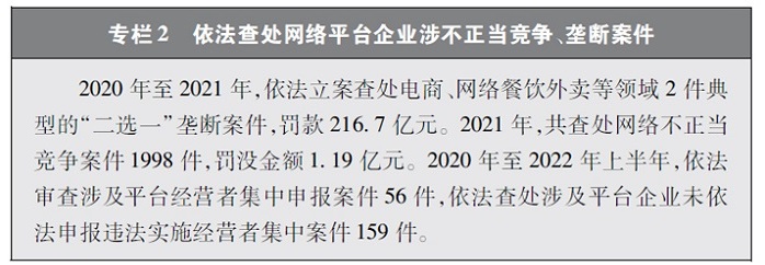 保障公平竞争的网络市场环境。随着网络平台企业不断扩展自身的体量和实力,“掐尖式并购”、无正当理由屏蔽链接、“二选一”、大数据杀熟、流量挟持等妨碍市场公平竞争的问题也逐渐凸显。中国积极回应人民群众诉求,在支持网络平台企业创新发展的同时,依法规范和引导资本健康发展,采取多种治理平台竞争失序的执法举措。聚焦大型网络平台价格欺诈、低价倾销等重点问题,通过行政约谈、行政指导、规则指引等多种监管手段,整治垄断和不正当竞争行为。围绕民生、金融、科技、传媒等重点行业,依法审查涉及平台经营者集中案件,防止可能妨碍市场竞争和创新发展的并购行为,引导网络平台企业增强合规意识,规范自身经营行为。通过一系列行动,平台经济市场环境不断优化,公平竞争的行业生态稳步向好,中小企业获得更广阔的发展空间,统一、开放、公平、竞争、有序的网络竞争环境正在形成。