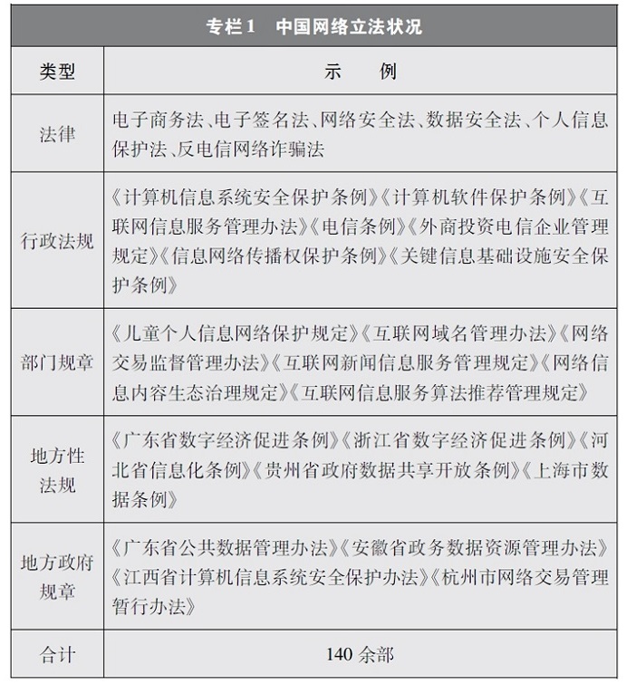 中国网络立法随着互联网发展经历了从无到有、从少到多、由点到面、由面到体的发展过程。第一阶段从1994年至1999年,是接入互联网阶段。上网用户和设备数量稳步增加。这一阶段网络立法主要聚焦于网络基础设施安全,即计算机系统安全和联网安全。第二阶段从2000年至2011年,是PC互联网阶段。随着计算机数量逐步增加、上网资费逐步降低,用户上网日益普遍,网络信息服务迅猛发展。这一阶段网络立法转向侧重网络服务管理和内容管理。第三阶段从2012年至今,是移动互联网阶段。这一阶段网络立法逐步趋向全面涵盖网络信息服务、信息化发展、网络安全保护等在内的网络综合治理。在这一进程中,中国制定出台网络领域立法140余部,基本形成了以宪法为根本,以法律、行政法规、部门规章和地方性法规、地方政府规章为依托,以传统立法为基础,以网络内容建设与管理、网络安全和信息化等网络专门立法为主干的网络法律体系,为网络强国建设提供了坚实的制度保障。