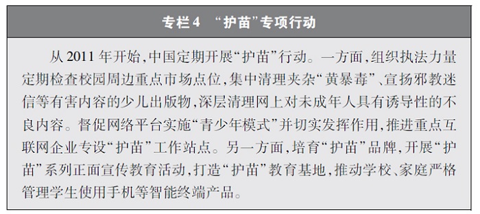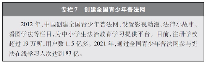 加强青少年网络法治宣传教育。青少年是祖国的未来、民族的希望。青少年网民在中国网民中的占比逐步增长。作为互联网的“原住民”,青少年是网上学习、交流、生活最活跃的参与者、实践者,其合法权益也更易受到网络违法活动的侵害。中国从保护青少年网络权益,促进青少年健康成长、全面发展出发,遵循青少年身心发展规律,贴近青少年学习生活实际,聚焦网络沉迷、网络欺凌、网络淫秽色情信息等重点问题,通过普法微综艺、儿童普法话剧、网络普法故事广播、网络普法云课堂、学法用法知识竞赛、法治副校长进校园、编写网络普法读本等生动活泼、丰富多彩的形式开展法治宣传教育,逐步形成了政府、社会、学校、家庭相结合的法治宣传教育格局,为提升青少年网民法治意识和网络安全素养提供了全面保障。