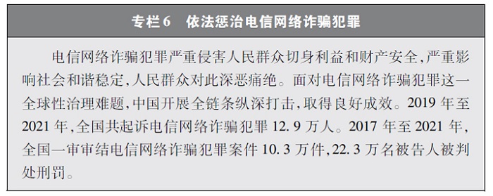 守护公民财产安全。持续加大立法保护力度,遏制利用网络侵犯财产权益的行为。2018年出台电子商务法,规定电子商务经营者销售的商品或者提供的服务应当符合保障人身、财产安全的要求。民法典明确利用网络侵害他人财产权益的行为应当承担相应法律责任。2022年出台反电信网络诈骗法,为打击电信网络诈骗活动提供有力法律支撑,切实维护人民群众的财产权益。