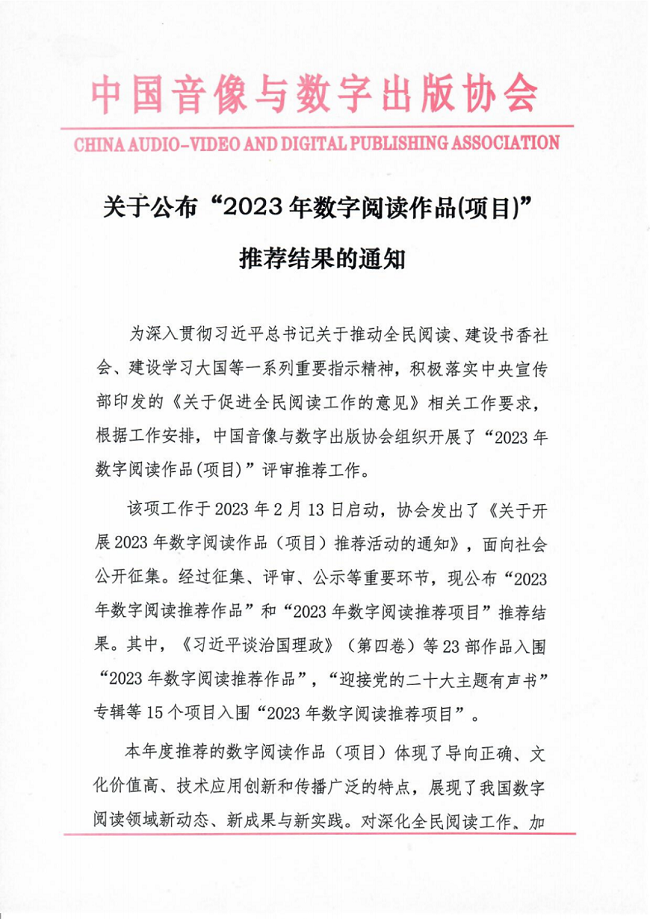 为深入贯彻习近平总书记关于推动全民阅读、建设书香社会、建设学习大国等一系列重要指示精神,积极落实中央宣传部印发的《关于促进全民阅读工作的意见》相关工作要求,根据工作安排,中国音像与数字出版协会组织开展了“2023年数字阅读作品(项目)”评审推荐工作。