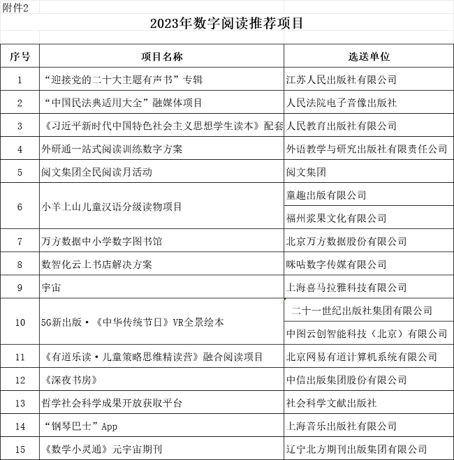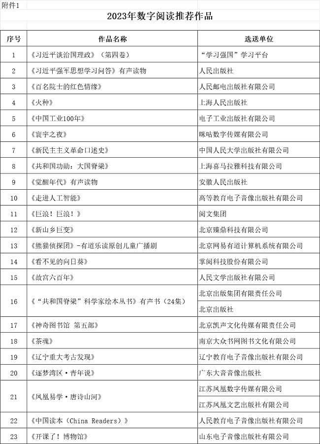 该项工作于2023年2月13日启动,协会发出了《关于开展2023年数字阅读作品(项目)推荐活动的通知》,面向社会公开征集。经过征集、评审、公示等重要环节,现公布“2023年数字阅读推荐作品”和“2023年数字阅读推荐项目”推荐结果。其中,《习近平谈治国理政》(第四卷)等23部作品入围“2023年数字阅读推荐作品”,“迎接党的二十大主题有声书”专辑等15个项目入围“2023年数字阅读推荐项目”。