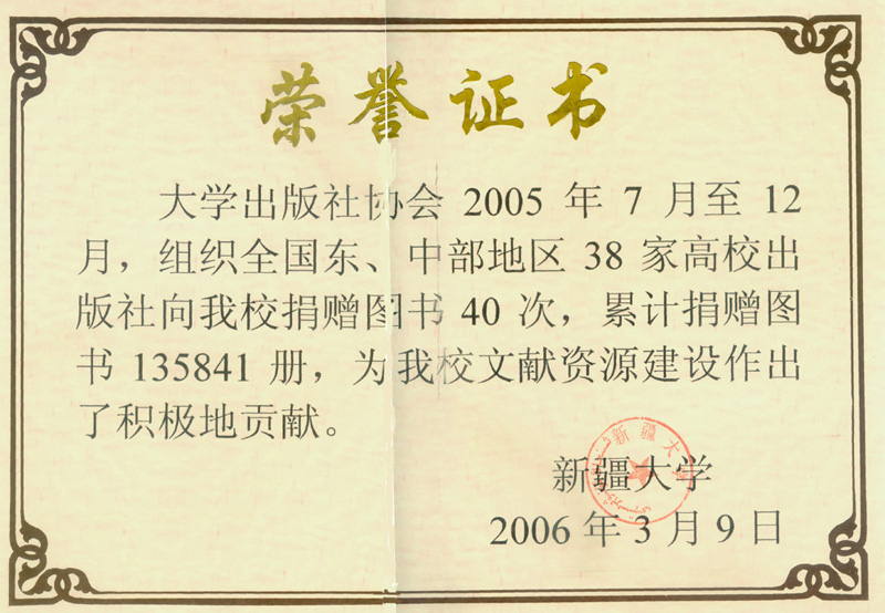 大学版协组织全国东、中部地区38家高校出版社向新疆大学捐赠图书荣誉证书