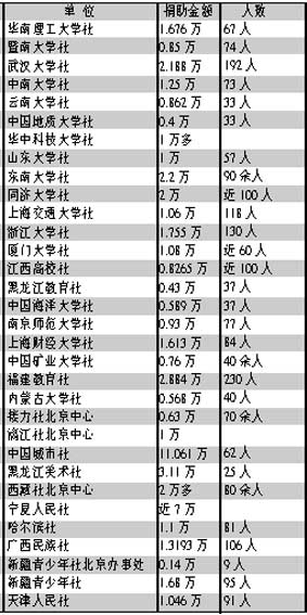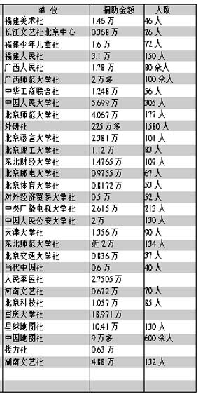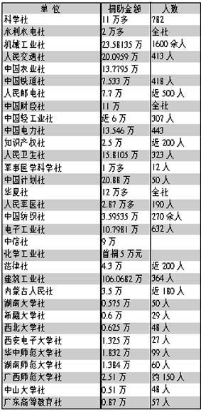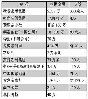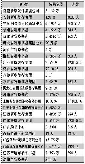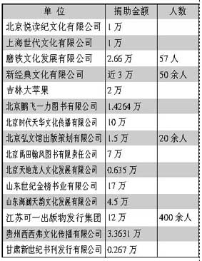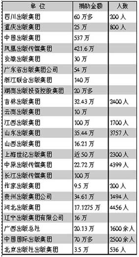 说明:本次捐款统计截止时间为5月15日20时;排序以调查反馈时间先后为准;捐助金额以元为单位;不少出版发行单位捐助款为员工个人捐助,还有一部分为单位和员工累计捐款;一些出版发行单位捐款尚在统计中,本报将继续跟踪报道。 河南大学出版社、西安交通大学出版社、陕西师范大学出版社、西北工业大学出版社由各自学校统一组织。 来源:《中国图书商报》2008-5-16