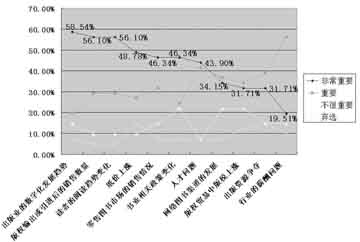 据公开数据显示,截至2006年底,欧美部分大型出版集团数字出版收益在其总收益中所占比例迅猛上升,其中汤姆森出版集团69%、里德·爱思唯尔集团70%、培生教育集团50%的收入均来自数字出版及网络相关业务。而在此次调查当中也映证了这一点——外方有58.54%的人最关心“出版业的数字化发展趋势”。