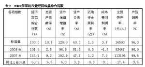 据记者了解,此项指标历来都以两位数的百分点超国家标准值,而2008年仅超标准值1.9个百分点。此外,其他7项相对指数值都有不同程度的下降:总资产贡献率只达2.6%,与国家标准值相差甚远,反映了企业全部资产获利能力低下;资产保值增值率与国家标准值也有很大距离,反映出企业的发展能力在降低;流动资金周转率的减缓、全员劳动生产率的大幅下降等,都显示出行业经济运行的总体质量在下降。