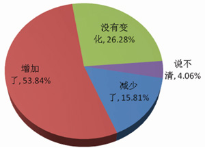 从开卷历年的调查数据来看,2004年以来,绝大多数读者的阅读时间都是逐年增加的(如图1所示)。本次调查中,相比于2006年阅读时间有所增加的读者比例为53.84%,没有变化的读者比例超过1/4,只有15.81%的读者阅读时间减少。