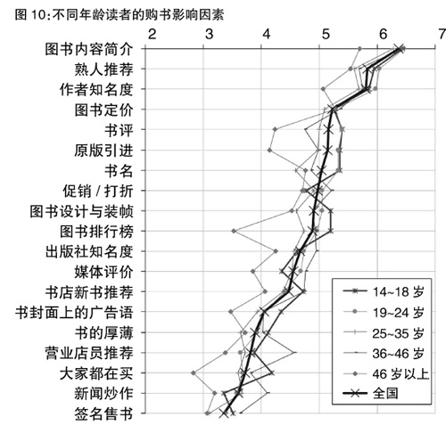 在调查中,我们列出了各种可能影响读者购买的相关因素由读者评分,满分10分表示完全有影响,0分表示完全无影响。综合全国的情况来看,最能影响读者购书的因素归结为图书内容简介、熟人推荐和作者知名度,三者的平均得分都在6分左右。此外,图书定价、书评、促销/打折、图书设计与装帧、书店新书推荐等因素也都不可忽视,得分基本在4-6分之间,签名售书、新闻炒作、从众心理等因素则不为多数读者看好,得分基本上在3-4分之间。在不同年龄的读者群之间,这些因素的影响没有特别显著的差异,只是年龄较小的读者受图书内容简介和熟人推荐的影响较大,而在年龄较大的读者群中,作者知名度的影响要大于熟人推荐的影响。总体来看,46岁以上的中老年读者的购书行为可能表现得更为谨慎,基本上各项因素对这类读者群的影响力都小于全国平均(如图10所示)。