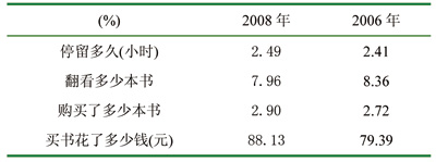 从调查的结果来看,2008年读者单次购书的书店停留平均时间为2.49小时,比2006年调查数据略有增加;读者单次购书平均花费88.13元,与2006年相比增加了8.74元。2008年,读者每次购书时购买的图书册数也有所增加,但是在书店翻看的图书册数和2006年相比略有减少(如图2所示)。这说明两年来读者进店买书的单次购买量有所增加,但是其选书过程呈现出更强的针对性,即“翻看的人少了、购买的多了”。