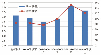不同收入的读者对于每次购书的花费和购书的册数是不同的。一般来说,收入越高的读者每次购买图书的册数与购书花费越高(如图3所示)。但是也不尽然,月收入在1001~3000元的读者单次购书花费和购书册数是最低的,甚至低于没有收入和月收入在1000元以下的读者,这是因为这些读者并非花费自己的收入来购书,大多数是父母提供的购书费用。