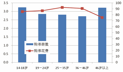 从不同年龄读者的购书情况来看,年龄在14~18岁和46岁以上的读者在单次购书费用上低于19~46岁的读者,但是购买的册数高于19~46岁的读者(如图4所示)。可见,这两个年龄段的读者购买的图书定价要低于19~46岁的读者。同时我们也在调查中发现,14~19岁读者购买最多的图书是中学用教辅类图书,而46岁以上的读者购买最多的图书是生活休闲和健康类图书,结合开卷零售监控数据可以了解,这两类图书的定价相对于整体图书市场来说是较低的。