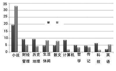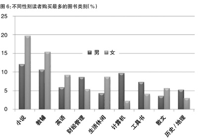 在调查中,我们也发现男性读者和女性读者最喜欢的图书有所不同。一般来说,女性读者中,喜爱小说、生活休闲、散文、英语类图书的读者更多,而喜欢经管、历史、地理、计算机、科技等类别图书的读者多为男性(如图5所示)。