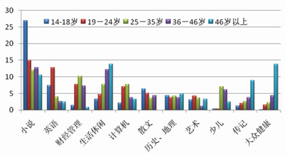 当然,除了给没有经济能力的少年儿童购买图书以外,大多数读者均是为自己购书。因此我们也在调查中发现,24岁以下读者购买英语类图书的比例最高,这个年龄段读者以青年学生居多。而25~35岁的读者购买经管类图书的比例超过了其他年龄段,而这个年龄段的读者大多数正是在走上工作岗位的第一个十年当中,对于职场和管理图书的关注自然在情理当中。