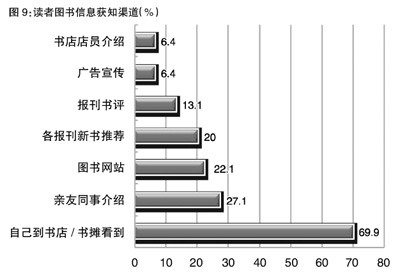 从开卷历年的调查数据来看,读者获取图书信息的渠道一直以“自己到书店/书摊看到”为主,2008年主要通过这种渠道获取图书信息的读者所占比例为69.9%。其次为通过“亲友同事介绍”,2008年所占比例为27.1%,而通过图书网站获知信息和通过报刊杂志的新书推荐获知信息的也分别占到了22.1%和20%,这是读者最主要的四种图书信息获知渠道,也最能影响读者的购买。与往年相比,这些结构没有发生明显的变化,也就是说,读者获取图书信息的习惯较为稳定(如图9所示)。