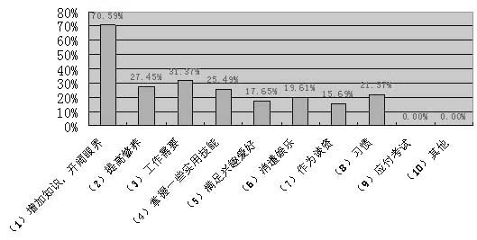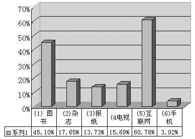 科技的发展日新月异,给现代人带来了极大便利,除了传统的图书、杂志、报纸、电视等媒体形式,互联网、手机、电子阅读器等多媒体的出现,极大丰富了人们获取知识和信息的方式,那么在这些媒介中,企业管理层认为哪种方式对自己的阅读最有帮助呢?选择“图书”的占45.10%;“杂志”占17.65%;“报纸”占13.73%;“电视”占15.69%;“互联网”占60.78%;手机占3.92%。无疑,互联网正成为企业管理者生活中必不可少的信息媒介。值得一提的是,目前主要针对高端人群的手机网上业务,还没有被广泛地认同和使用。