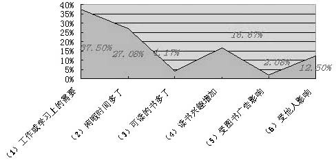 至于读书时间增加了的主要原因,“工作或学习上需要”的为37.50%;“闲暇时间多了”的为27.08%;“可读的书多了”的为4.17%;“读书兴趣增加了”的为16.67%;“受图书广告影响”的占2.08%;“受他人影响”的为12.50%。看来,工作或学习需要是阅读的最大动力。