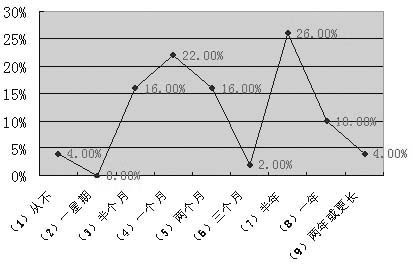 企业管理人所读书籍的来源,85.71%的人是自己购买,只有14.29%到图书馆等地借阅。在多长时间购买一次图书的调查中,半年左右购买一次的居多,占到26%;其次,主要是1个月一次的,为22.00%;半个月购买一次和两个月购买一次的,所占比例一样,为16%;一年购买一次也不在少数,占10%;两年或更长购买一次图书的与从不购买图书的企业管理者人数一样,都为4.00%;其中,有2.00%的人从不购买图书。值得一提的是,在51个样本中,没有企业管理人有一周购买一次图书的行为。