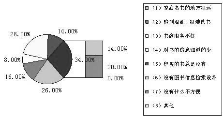 究竟是什么影响了他们的购书呢?是因为家离购书地点比较远吗?“家离书店500米以内”的占20.00%;“1公里以内”的为15.56%;“2公里以内”的为22.22%;“3公里以内”的为20.00%;“4公里以内”的占2.22%;“5公里以内”的为6.67%;“10公里以内”的为4.44%;“10公里以上”的为11.11%。看来,很多调查对象确实因为书店离家远而影响了购书行为。因此,26.00%的人认为“家离买书地方很远”而有些不方便;16.00%人认为“书店陈列混乱,很难找书”;8.00%的人认为书店服务不好;“想买的书总是没有”、“没有图书信息检索设备的”等因素影响购书的比例都差不多,各占14.00%;20%的人“购书没有什么不方便”。值得一提的是,“对书的信息知道得少”的人高达28.00%,这一数字有些让人出乎意料之外,除了提醒出版社要加大图书的宣传推广力度外,在此,也要呼吁读者多进图书馆。
