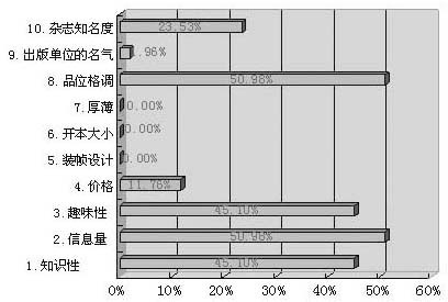 企业管理层购买杂志最关心的主要因素是“信息量”和“品味格调”,各有50.98%的企业管理者会关心这些;分别有45.10%比较看重“知识性”和“趣味性”;23.53%的会看重杂志知名度。对于杂志社来说,打造好的内容,提高品位,贴近读者的阅读趣味,是实现大逆转的有效方式。要特别说明的是,作为社会消费主体,企业管理层相对于其他阶层而言,品牌意识比较重。不管是出版社还是杂志社都要注意维护自己的品牌。