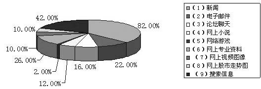 企业管理人通过互联网,主要是干什么呢?浏览新闻的占到82.00%,收发电子邮件的占到22.00%,在网上进行论坛聊天的为16.00%;看网上小说的为12.00%;玩网络游戏的为2.00%;通过互联网查阅专业资料的占到26.00%;各有10.00%的人进行网上视频图像和看网上股市走势图;42.00%的人利用互联网“搜索信息”。看来,除信息之外的网络阅读的引导尤其重要。