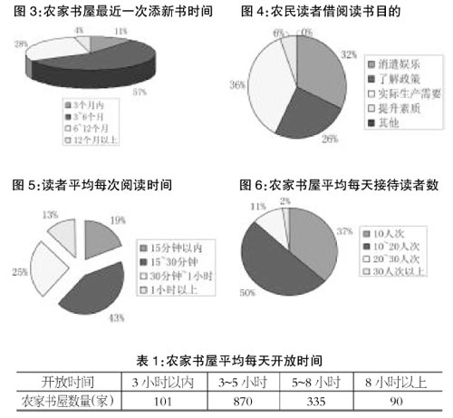 2/3以上的农家书屋每天开放时间为3~5小时,5~8小时的有300多家,8小时以上的只有不到100家,还有百余家甚至每天只开放不到3小时(表1)。而即使是开放时间在8小时以上的,由于管理员时常会因为个人原因或工作而暂时关闭农家书屋,也就难以保证农民读者在空余时间随时能到农家书屋阅读图书。