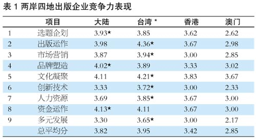 竞争力分析是了解地区发展实力的一种重要方法。中国人民大学新闻学院博士、台湾资深出版观察者刘筱燕女士通过对两岸四地出版企业和出版人的大量调查与访谈,写出了研究报告《华文出版市场区域竞争力分析》。该报告通过对选题策划、出版运作、市场营销、品牌塑造、文化凝聚、创新技术、人力资源、资金运作、多元发展等九项指标(见表1)共54个细项的分析,既评估了四地出版企业竞争力的特点和优势,探讨了各地出版产业的发展策略和整合方向,以及建立既有区域特点,又有文化共性的大华文出版市场的可行性与意义。