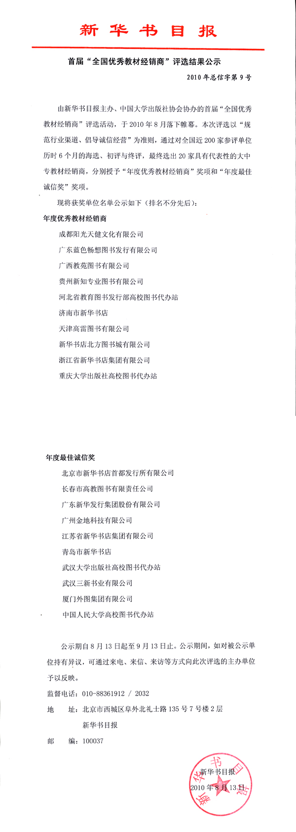 首届“全国优秀教材经销商”评选结果公示 - 出版新闻 - 中国高校教材图书网