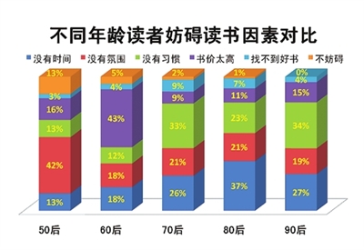 年龄层越低的读者表示自己没有时间读书的人数越多,尤其体现在“70、80后”的上班族,而年龄较大的读者则更多认为目前书价过高、阅读没有氛围。此外,找不到优秀图书也成为读者阅读的障碍,而只有2%的读者表示不存在任何因素影响自己平时阅读报纸、图书(见图13)。