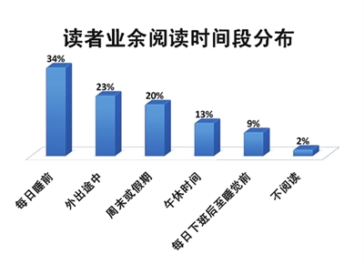 在外出途中读书、看报,已经成为目前大众读者阅读的重要时间段,尤其北京地区,人们外出路途远、时间长,仅按每日上班单程耗费40分钟计算,每天上下班路途则有80分钟,每周5个工作日则会在途中耗费400分钟即6.6个小时,累计到每月4周则有1600分钟26.6个小时,全年仅上下班途中就要花费320小时、约合26个白天(12小时计)!本次调查显示,53%的读者表示会以阅读来打发在路上的时间,这一比例较2010年同期增加3%。外出途中阅读具有碎片化、便携化等显著特点,适合短篇幅、即时性的阅读内容,相应的内容提供商完全可以考虑大力开拓便携、浅易的阅读内容。