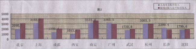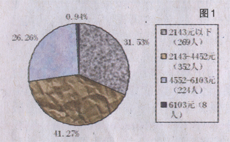 选择“2143元以下”的,有269人,占样本总量的31.53%;选择“2143至4452元”的有352人,占样本总量的41.27%;选择“4552至6103元”的有224人,占样本总量的26.26%;选择“6103元”以上的仅为8人,占样本总量的0.94%。(见图1)