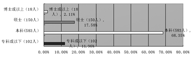 在本次问卷中的第二个问题就是:你的是什么学历?选项有四个:专科或以下,本科,硕士(含在读),博士(含在读)及以上,每个人勾选其中之一。其中,“专科或以下”102人,占到样本总量的11.96%;“本科”583人,占到样本总量的68.35%;“硕士”150人,占到样本总量的17.58%;“博士”仅有18人,仅占样本总量的2.11%。(见图3)