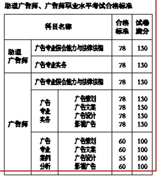 《中国新闻出版报》记者11月8日从中国广告协会获悉,2011年度助理广告师、广告师职业水平考试合格标准现已确定并对外公布。同时,2012年度的考试时间确定为2012年5月26日~27日。 广告业实施专业技术人员职业水平评价制度,对于加强行业管理,促进广告业健康发展,提高广告专业技术人员素质具有重要意义。今年6月,助理广告师、广告师职业水平考试首次开考并获得圆满成功,这标志着广告专业技术人员职业水平评价工作迈出了第一步,也为落实广告专业技术人员职业水平评价制度并不断完善奠定了良好的基础。 据悉,助理广告师、广告师职业水平考试合格标准是经人力资源和社会保障部、国家工商行政管理总局研究确定的。目前,各省、自治区、直辖市广告专业职业水平考试考务管理机构已经开始公布考试成绩、合格标准、确定合格人员名单,并将按照工作程序,向考试合格人员发放相应级别、专业的《中华人民共和国广告专业技术人员职业水平证书》,发证情况将送当地省级人事行政部门备案。