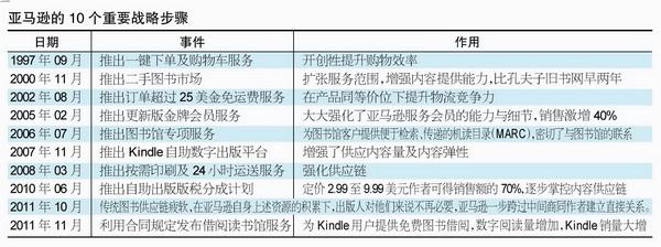 十步战略 掌控供销链 亚马逊为何总能赢得漂亮,令众出版商欲抗不能? 很多业内人士并未注意到,虽然皆是行业巨头,但亚马逊并不同于谷歌、苹果、脸谱以及微软等企业,靠投资开发出一项新产品或服务称霸业内。亚马逊靠的是数项稳扎稳打、步步为营的战略步骤,逐渐拿下了整个既存的出版产业。亚马逊甚至没有让出版业经过所谓的“改朝换代”阶段——在“亚马逊王朝”之前,出版业并没有谁的朝、谁的代。更重要的是,目前看来,亚马逊已经极大地掌控了出版产业中至为重要的供销环节。 只要回顾亚马逊在过去十年中的10个重要战略步骤,就能更好地理解它是如何一步步将整个产业链收入囊中。(见表格) 而这些只是亚马逊过去十几年中在图书供销链方面采取的战略,其硬件设备的研发、完善亲民的服务体系以及向书业外地其他零售领域伸出的触角等等,更是亚马逊战略的重要组成部分。