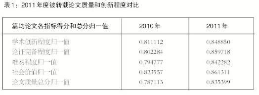 从转载论文各指标得分和总分归一值来看,2011年度《复印报刊资料》转载论文的整体质量和创新程度比2010年度略有提升。如表1所示,2011年度《复印报刊资料》转载论文学术创新程度、论证完备程度、社会价值和难易程度4项指标的篇均得分归一值,分别比2010年度提高了0.037738、0.057434、0.047505和0.037754,篇均论文质量总分的归一值也比2010年度提高了约0.048286。