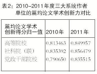 三大系统论文学术创新力同步提升。在日益强化“定量与定性综合”评价理念和“由数量评价向质量评价转变”基本导向的影响下,我国三大系统的人文社科论文创新程度同步提升。如表2所示,与2010年度相比,2011年度高等院校、社科院(联)和党政干部院校作者论文的篇均学术创新得分归一值,均有不同程度的提升。社科院(联)作者的篇均学术创新程度得分的归一值比其他两个系统略高一筹,但高等院校和党政干部院校的提升幅度较大,学术创新力显著增强。