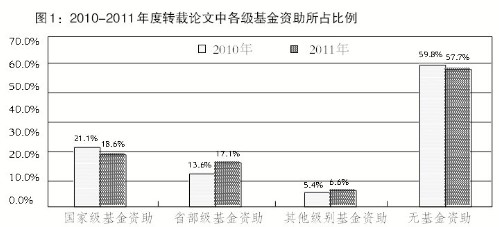 基金资助对学科研究方向引导作用突出。2011年度人文社会科学的热点研究领域,以当前我国经济社会发展中的全局性、战略性、前瞻性问题为主攻方向。以经济学为例,学术研究热点包括产业结构优化、土地财政、国际货币体系、养老保险、粮食问题、低碳经济、分配公平、通货膨胀等,在这些经济学热点领域的研究论文中,基金资助论文占比为59.7%,显著高于所有被转载论文中基金资助比例的平均水平42.3%,这说明国家在人文社科领域科研经费的投入对学术研究的方向发挥了重要的引导作用。