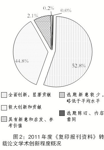 在《复印报刊资料》“优中选优”的选文过程中,将论文的学术创新程度分为5档,如图2所示,在《复印报刊资料》2011年度的13325篇选文中,约98%的论文处于前两档,即实现了观点、方法等方面的“全面创新,对学术发展具有显著贡献”,或者“实现了较大的创新和贡献”;转载论文中没有“选题陈旧、内容雷同”的论文。