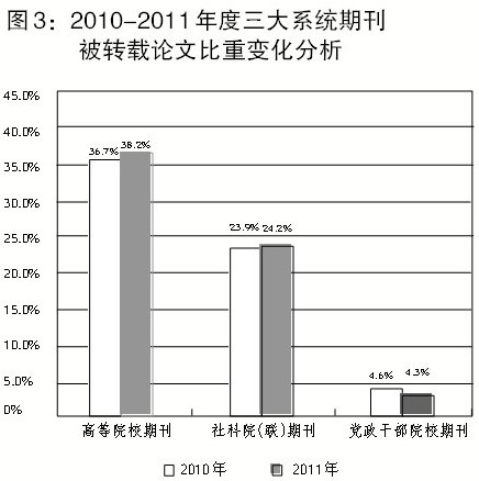 高等院校和社科院(联)期刊的优势进一步加强。与2010年度相比,三大系统主办期刊被转载论文占《复印报刊资料》转载期刊论文总量的比例出现了变化,如图3所示:高等院校主办期刊被转载论文的比重比2010年度增加了1.5%,社科院(联)主办期刊被转载论文的比重也略有提升,党政干部院校主办期刊的被转载论文则出现了0.3%的小幅下滑。可见,三大系统主办期刊中,优势进一步向高等院校和社科院(联)两个系统发展。高等院校和社科院(联)主办期刊的整体实力稳中有升,且高等院校主办期刊被转载论文所占比重的上升幅度要高于社科院(联)主办期刊,党政干部院校主办期刊的总体实力在三大系统中略有下降。