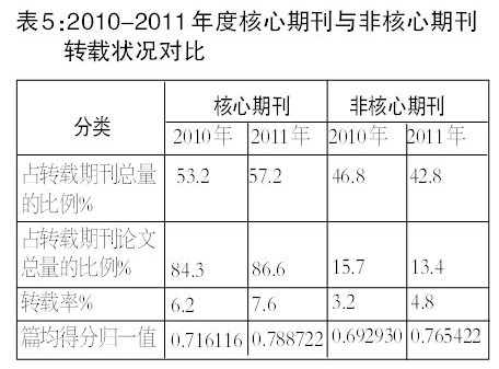 非核心期刊也刊发了不少优质论文。表5还显示,2011年度《复印报刊资料》转载论文涉及的期刊中,非核心期刊约占42.8%,非核心期刊被转载的论文总量约占《复印报刊资料》转载总量的13.44%。这说明非核心期刊上也刊发了一定数量的优质论文。从这一角度来看,《复印报刊资料》坚持“文章不论出身”的原则,通过二次转载,使发表在非核心期刊上的优质论文的学术价值得到广泛传播和发扬,修正了“以刊评文”的不合理做法。